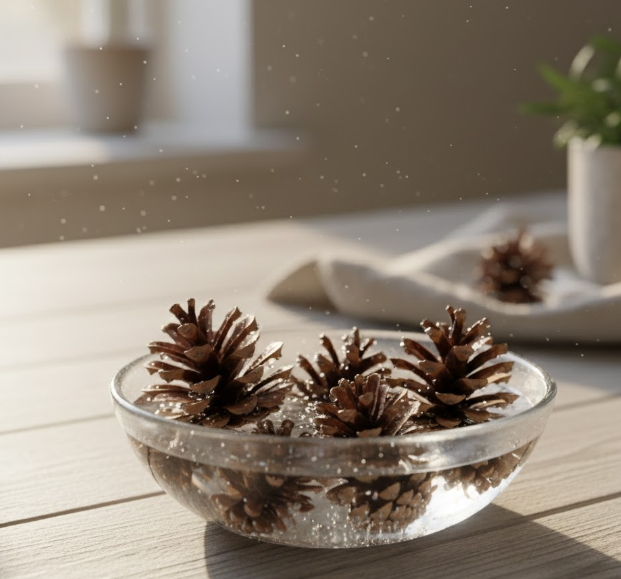 - 솔방울 천연 가습기: 산에서 주워온 솔방울을 깨끗이 씻어 물에 담가두면 수분을 머금어 오므라듭니다. 이를 바구니에 담아두면 서서히 수분을 뿜어내며 펴집니다.