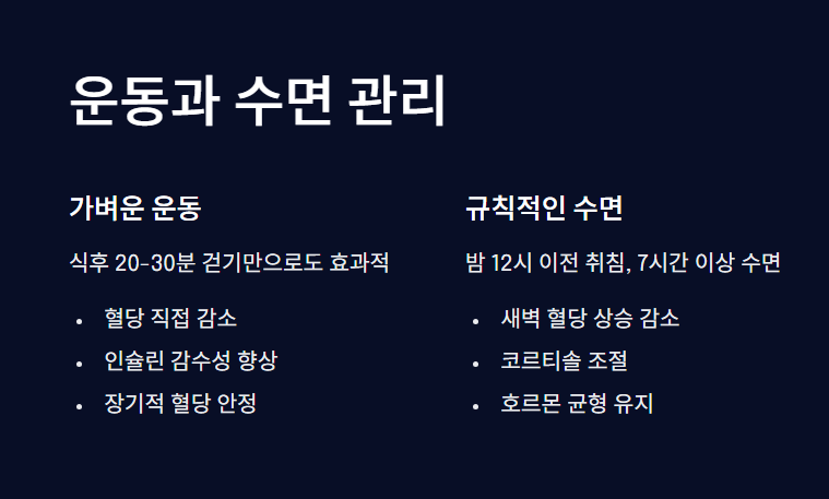 밤 12시 이전에 잠들고, 7시간 이상 수면하는 것이 좋습니다. 취침 2~3시간 전 음식 섭취를 피하면 새벽 혈당 상승도 줄어듭니다.