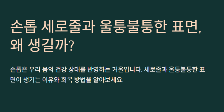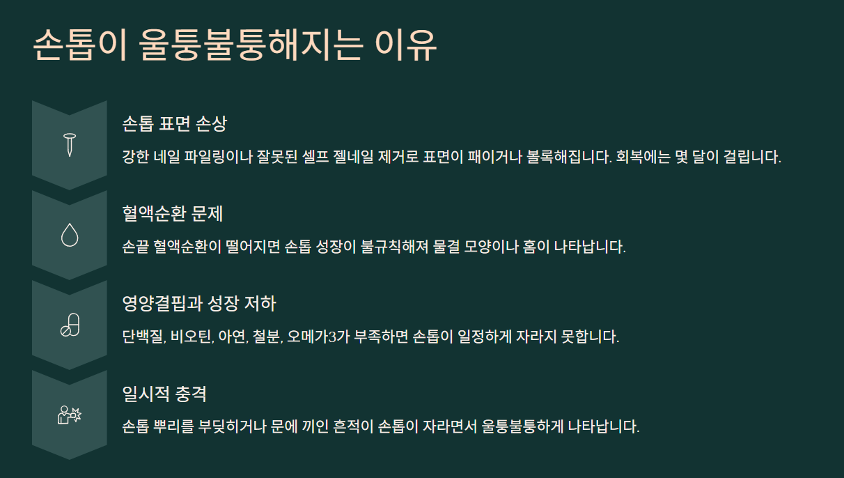 특히 손톱 세로줄, 손톱 울퉁불퉁, 손톱 패임은 단순한 노화 과정일 때도 있지만,