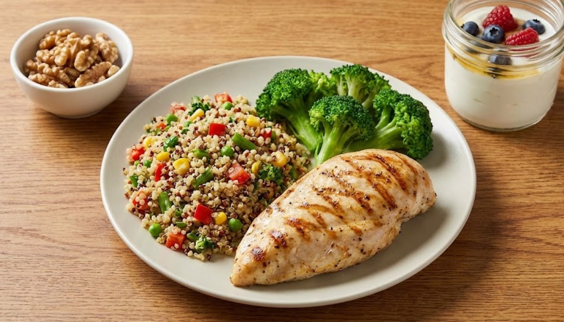 하루 세 끼를 규칙적으로 섭취하고, 매 끼니마다 체중 1kg당 1~1.2g의 단백질을 섭취하는 것을 목표로 합니다. 예를 들어 체중이 60kg인 사람이라면 하루 60~72g의 단백질이 필요합니다. 단백질만 집중적으로 섭취하는 것이 아니라, 탄수화물, 지방, 비타민, 미네랄이 골고루 포함된 균형 잡힌 식단을 구성해야 합니다.