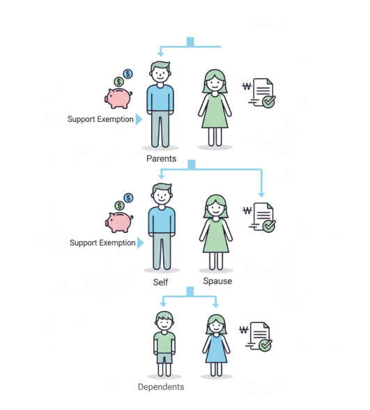 | 직계비속(자녀) | 만 20세 이하 | 소득금액 100만 원 이하 | 동거(해외 체류 포함) | 한부모 공제 등 |