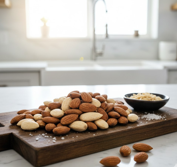 섭취 방법: 하루 한 줌(약 30g, 20~25알) 정도가 적당합니다. 과도하게 먹으면 칼로리가 높아 살이 찔 수 있으므로 주의하세요. 간식으로 그대로 먹거나, 샐러드에 토핑으로 올리거나, 아침 시리얼에 섞어 먹을 수 있습니다. 소금이나 설탕이 첨가되지 않은 생견과류를 선택하세요.